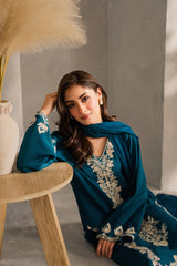 VINTAGE-3PC DHANAK EMBROIDERED SHIRT WITH BAMBER CHIFFON DUPATTA AND TROUSER-14259